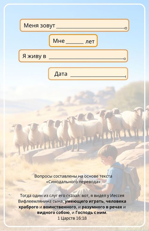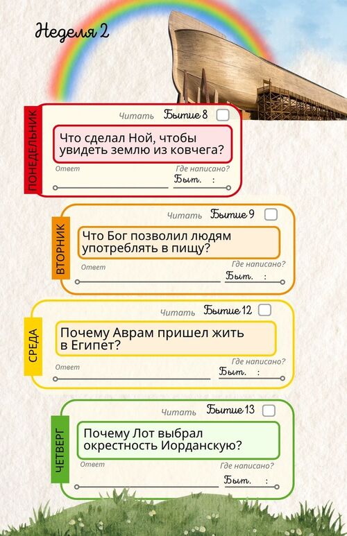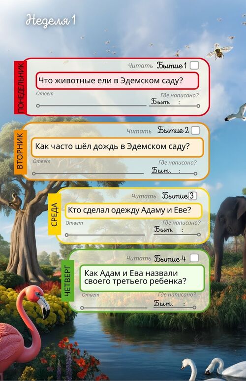 Ребёнок прочитает 312 глав из Библии — начиная с книги Бытие и до книги Откровение. С понедельника по субботу он будет читать по одной главе и отвечать на вопрос, который задан из этой главы.