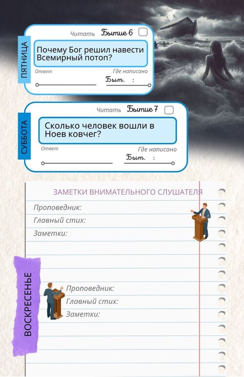 В воскресенье ребёнок должен взять с собой свой план в Дом Молитвы, чтобы записывать заметки из проповеди.