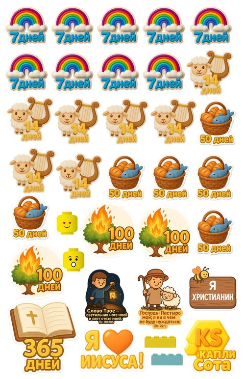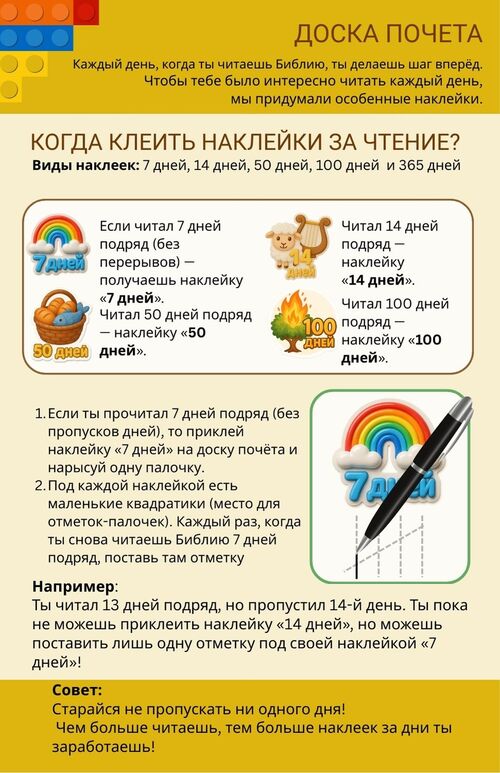 На последней страничке есть место, куда дети будут наклеивать наклейки, чтобы видеть, насколько регулярно они читают Библию — каждый день, без пропусков.