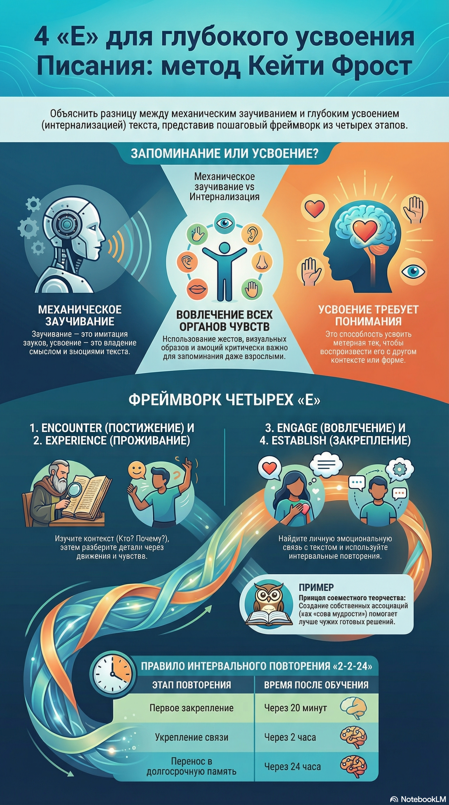 • Правило «2224»: Для эффективного запоминания Кейти советует повторять материал через 20 минут, через 2 часа и через 24 часа. Затем — ежедневно в течение недели и далее раз в неделю.