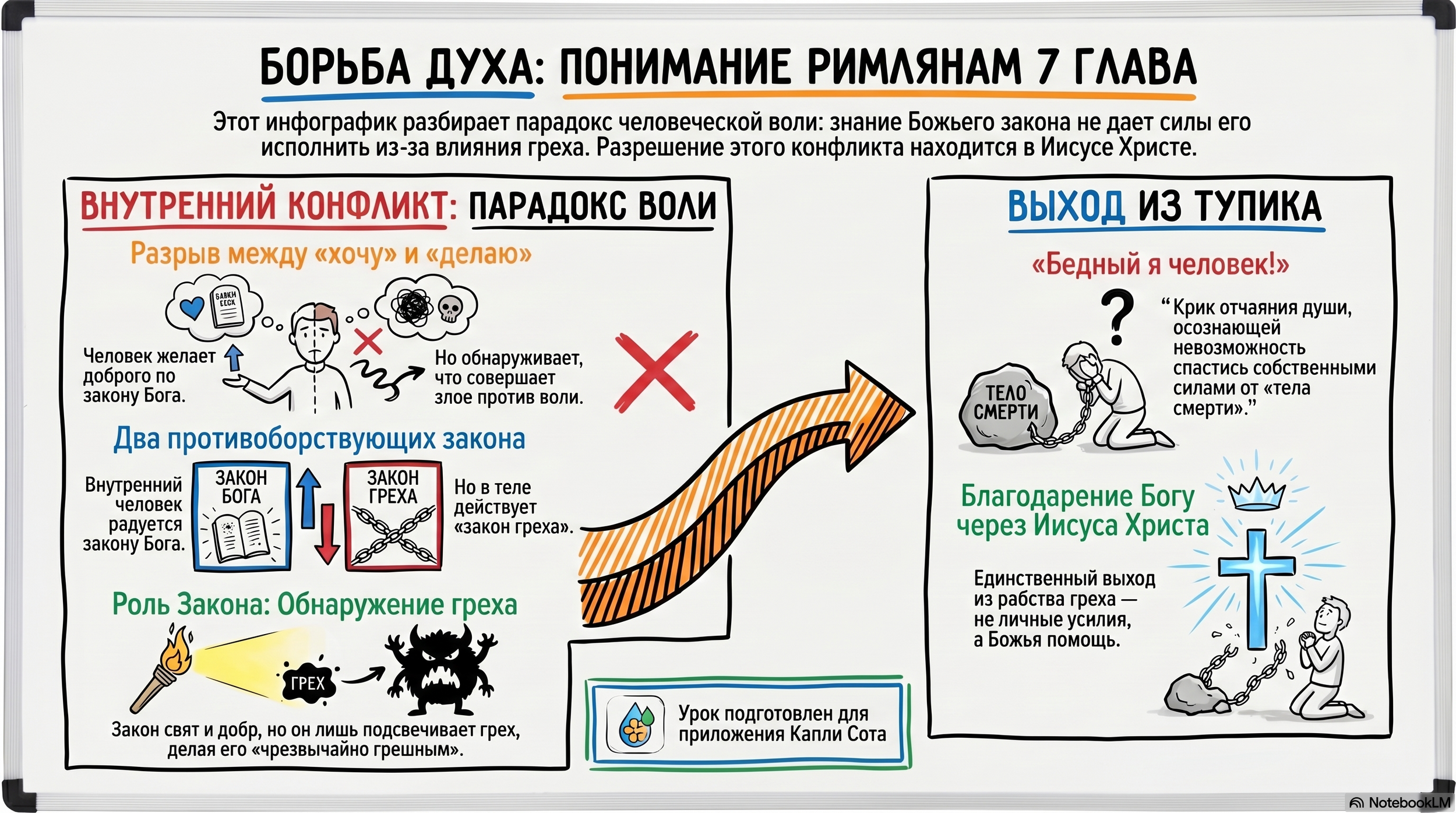 ➤ Бессилие человека без Христа: Человек сам по себе не способен преодолеть грех, даже если желает делать добро (Рим. 7:18-20).