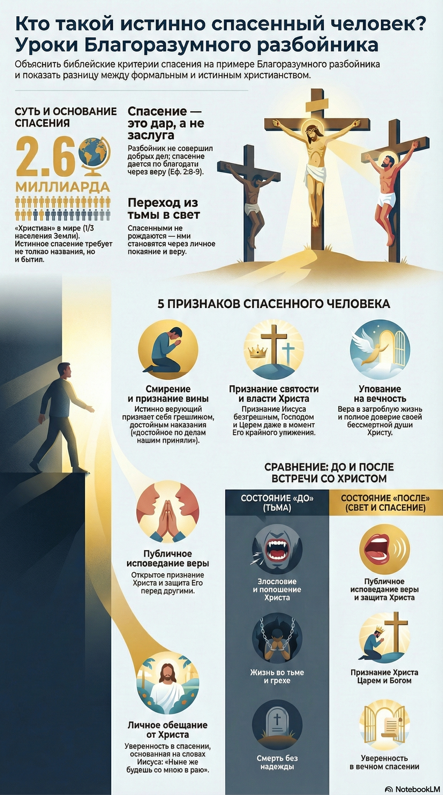Этот человек не имел возможности исправить свою жизнь делами, но его состояние сердца стало ключевым. Через этот библейский пример мы раскрываем 5 основных признаков спасённого человека, которые остаются актуальными для каждого христианина сегодня.